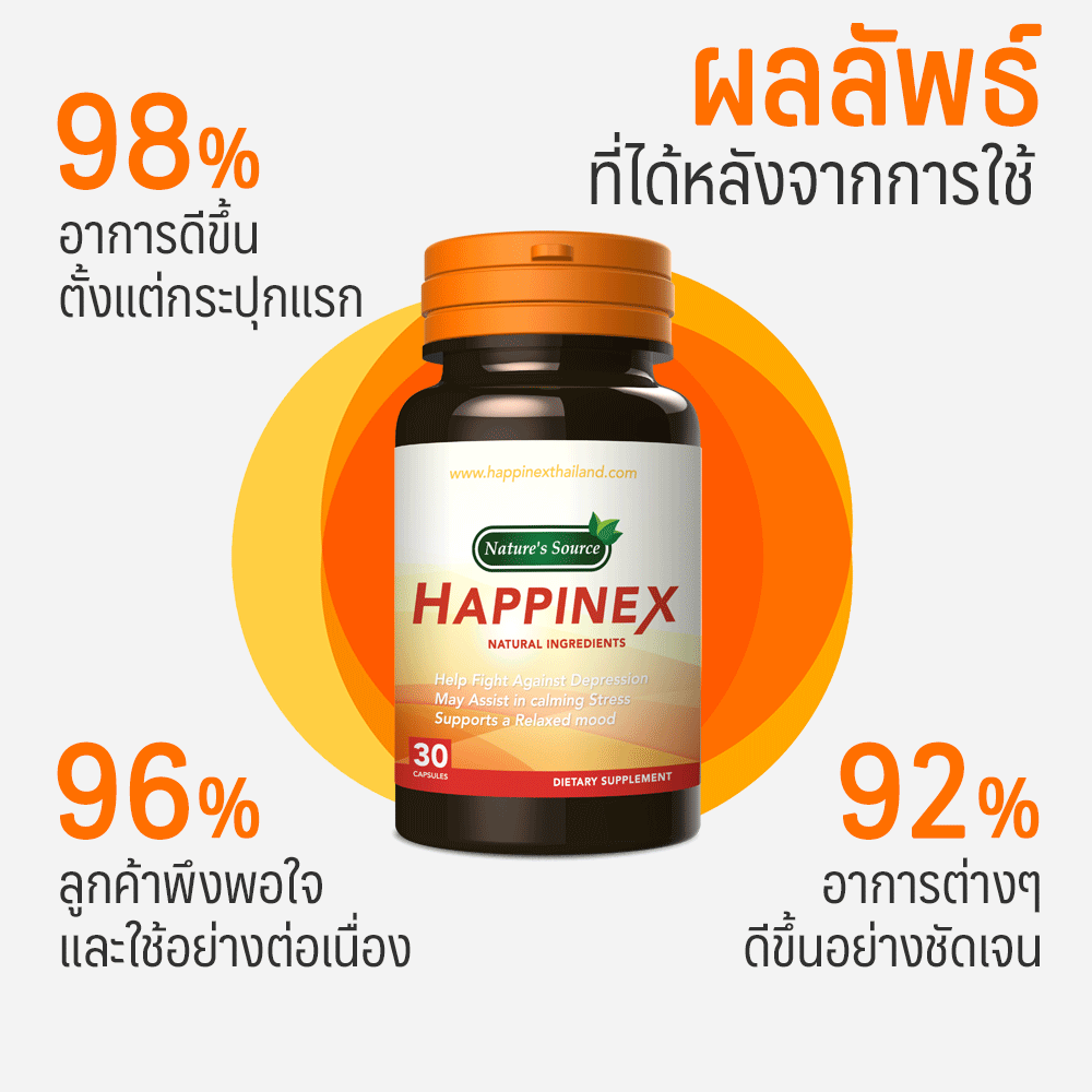Happinex (แฮป-ไพ-เน็ก) เป็นผลิตภัณฑ์เสริมอาหารทางการแพทย์ เป็นสูตรที่พัฒนาโดยทีมแพทย์ทางระบบประสาทและสมอง ร่วมกับนักพฤกษเคมีผู้เชี่ยวชาญ โดยคัดสรรสารสกัดจากสมุนไพรธรรมชาติที่ดีที่สุด สำหรับผู้ที่มีปัญหาสุขภาพโดยไม่มีผลข้างเคียง ไม่มีสารเคมีตกค้าง ไม่มีผลให้ตับ และไตเสื่อม ซึ่งจะมีผลให้เป็นโรคแทรกซ้อนอื่นๆได้อีก